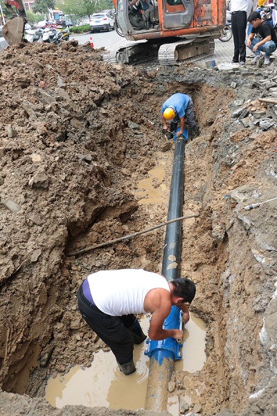 经过2个小时不间断开挖作业,受损管道终于“露脸”。抢修人员利用水泵迅速抽干工作坑内积水,用手锯锯断受损管道,并采取“哈夫节”工艺更换了新的管材。