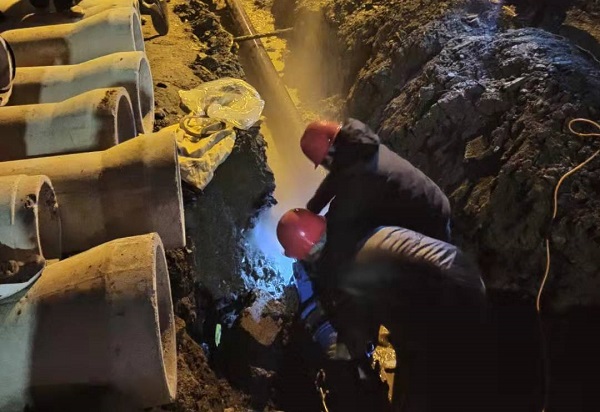 同样在1日下午,阅城国际小区的DN160三通出现损坏。工作人员备好相关机械设备和材料,第一时间赶赴现场,立即进行开挖作业。虽然开挖难度大,施工情况复杂,但抢修人员坚持不懈,小心翼翼地挖出受损的三通,于当晚9点完成修复。