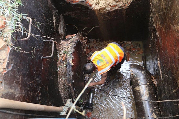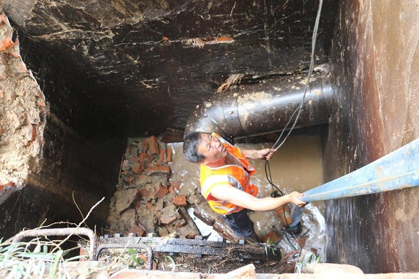 由于破损管径太大,管内余水仍存在压力,出水量很大导致无法迅速排水,基坑里水位较高,且基坑较高存在塌方隐患,给抢修工作带来很大的困难。在施工现场负责人调整了施工方案后,安装公司尤忠祥等一批老党员同志主动请缨,甚至光着膀子就直接进入泥泞的竖井抢修区开始管道清淤、抽水和焊接修复等工作。