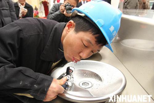 一名工人率先体验世博直饮水